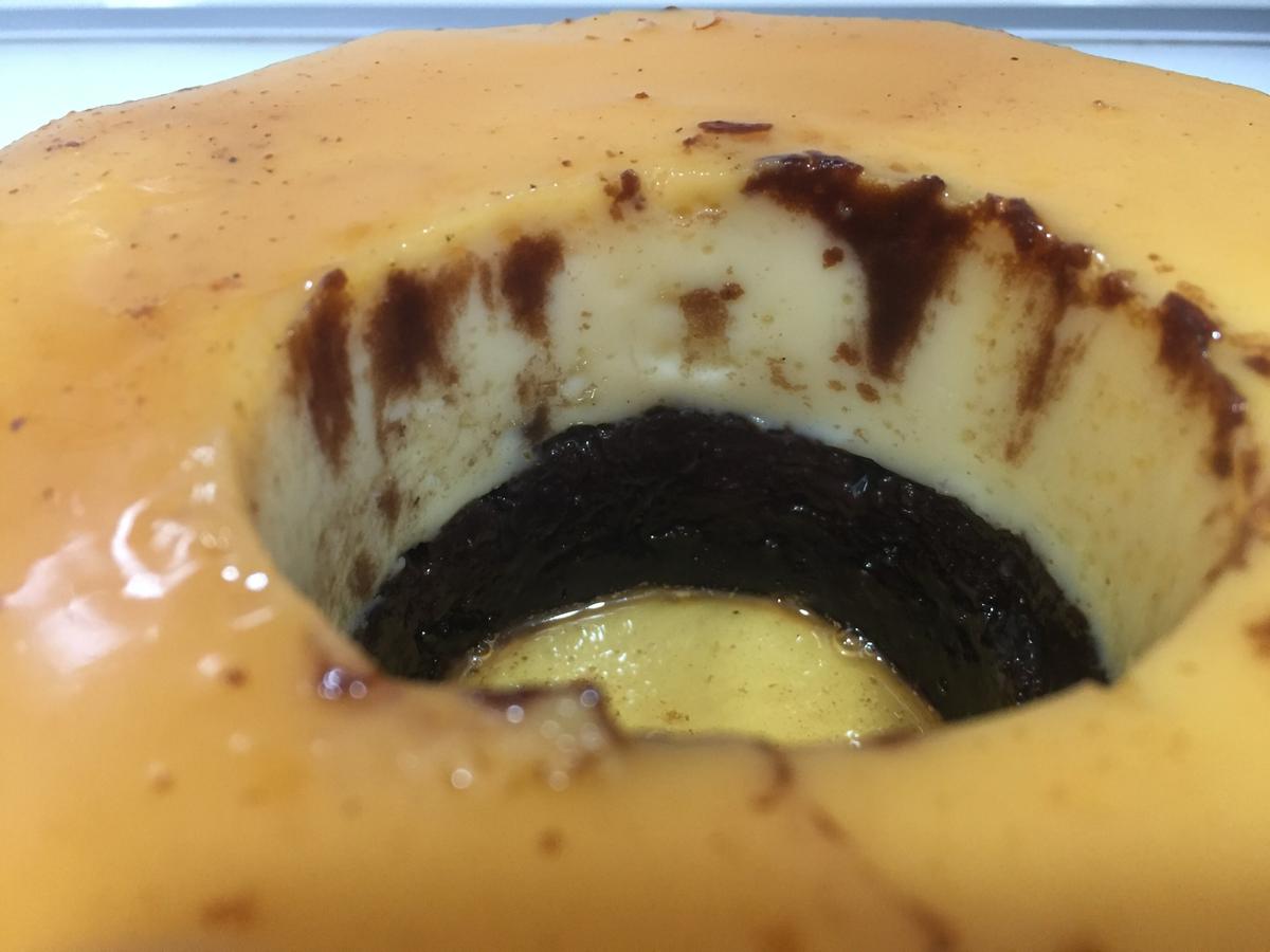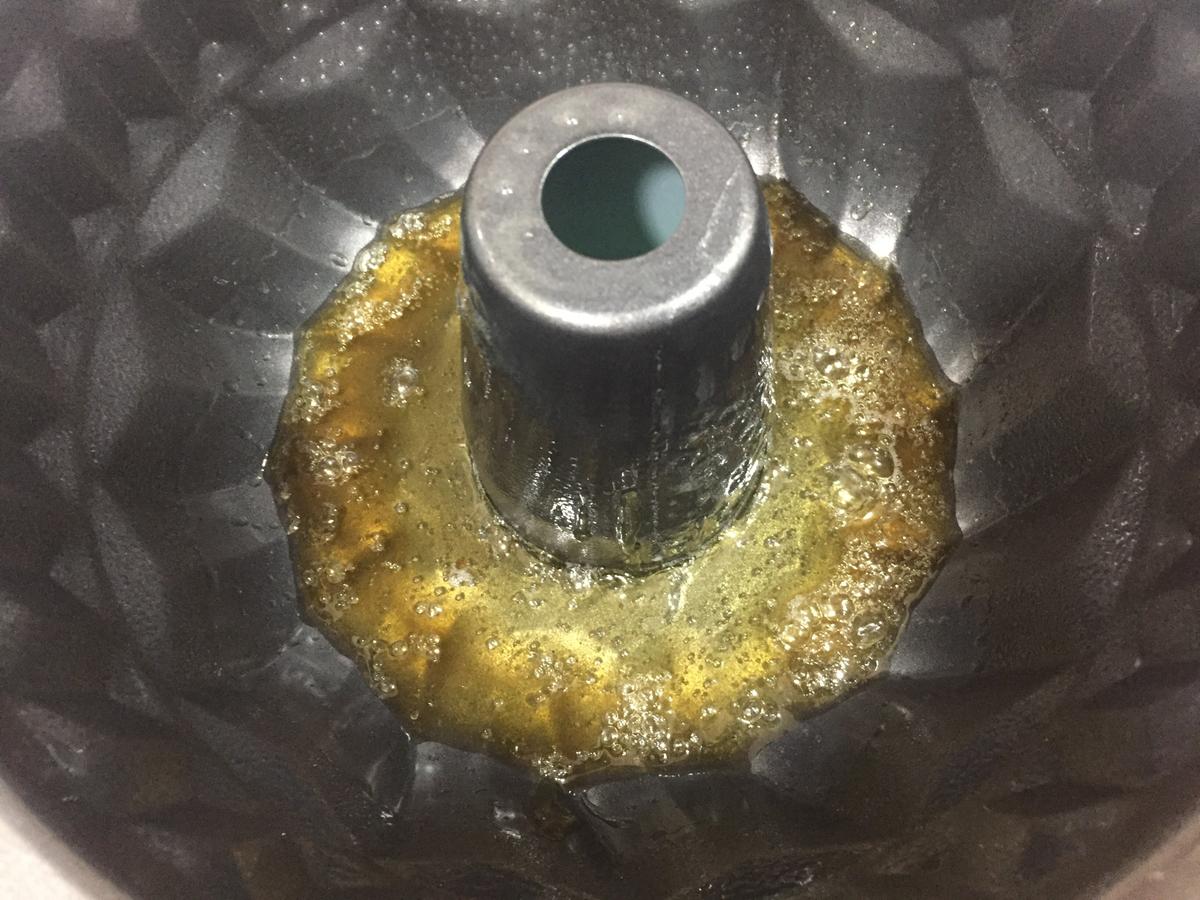 Rociamos el molde con spray desmoldante o bien mantequilla y harina. Echamos en el fondo el caramelo.