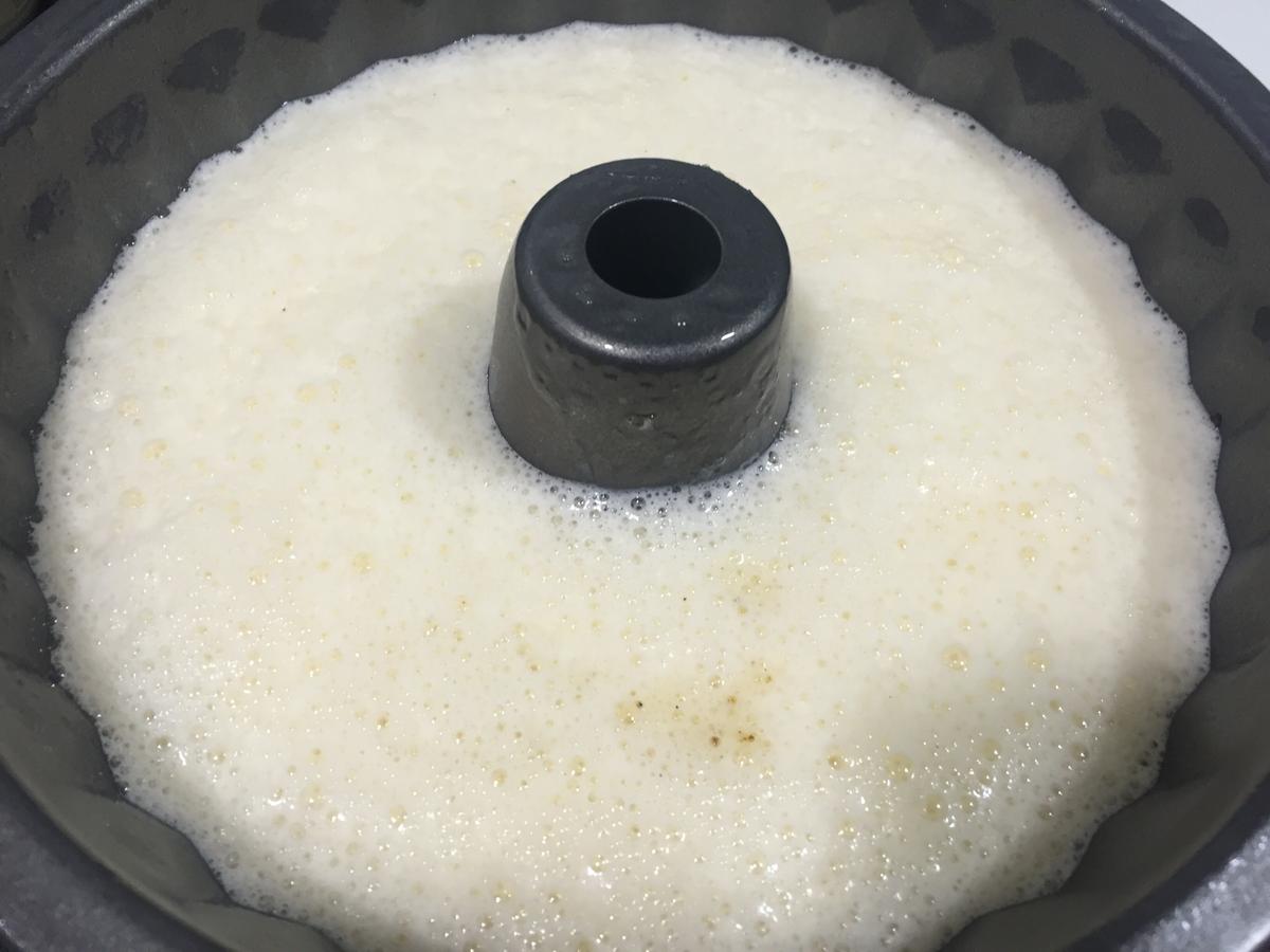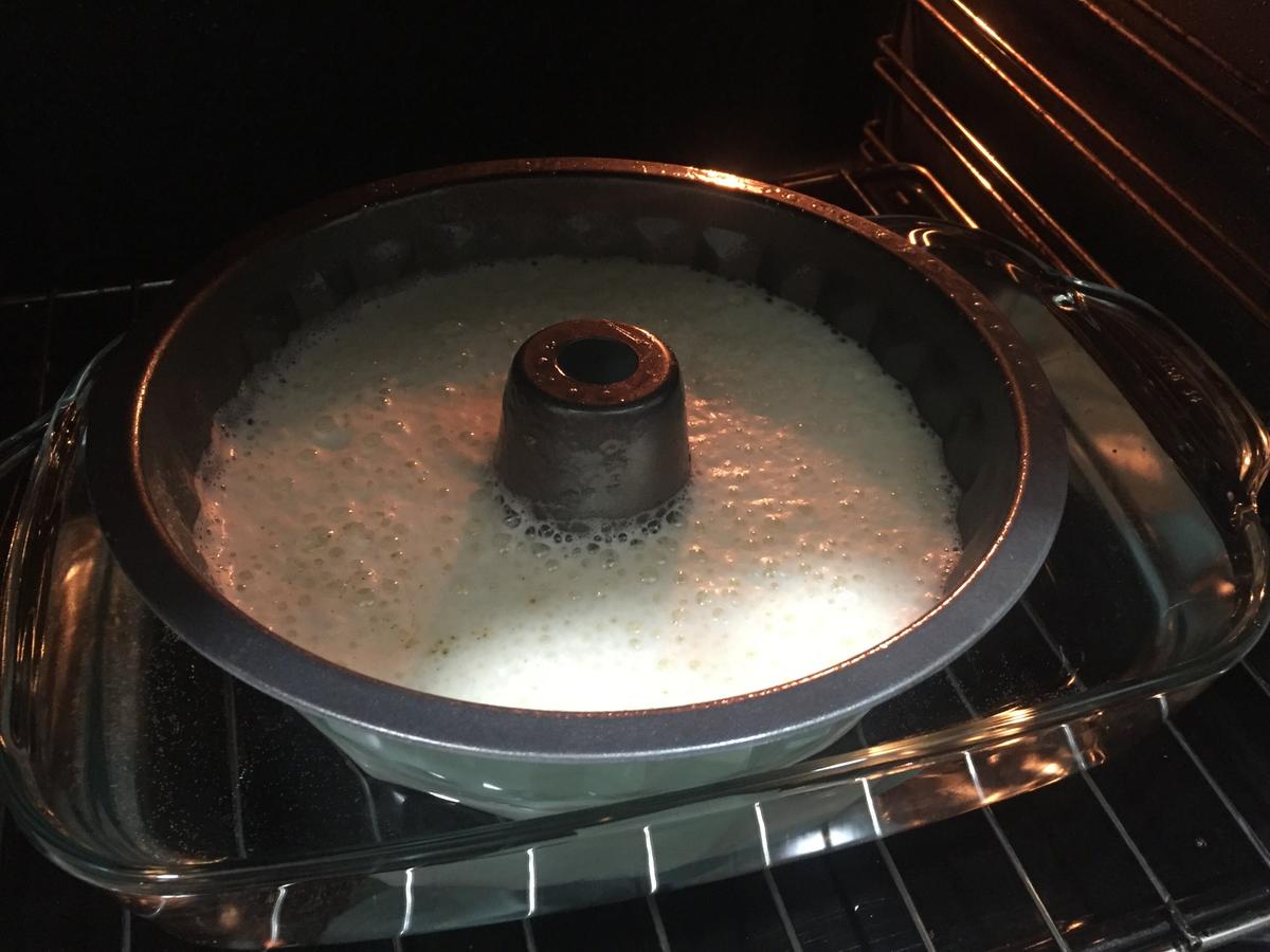 Primero pondremos el horno a calentar a 190 grados con un molde lleno de agua suficiente como para que nos cubra nuestro molde más o menos hasta la mitad.