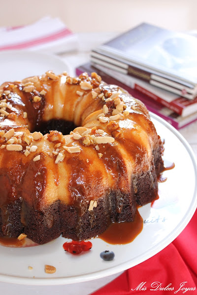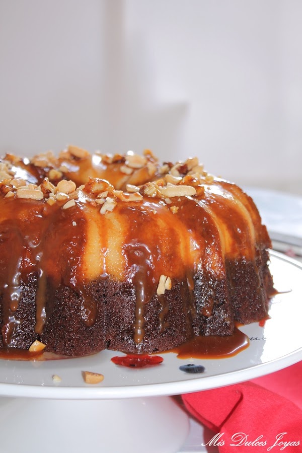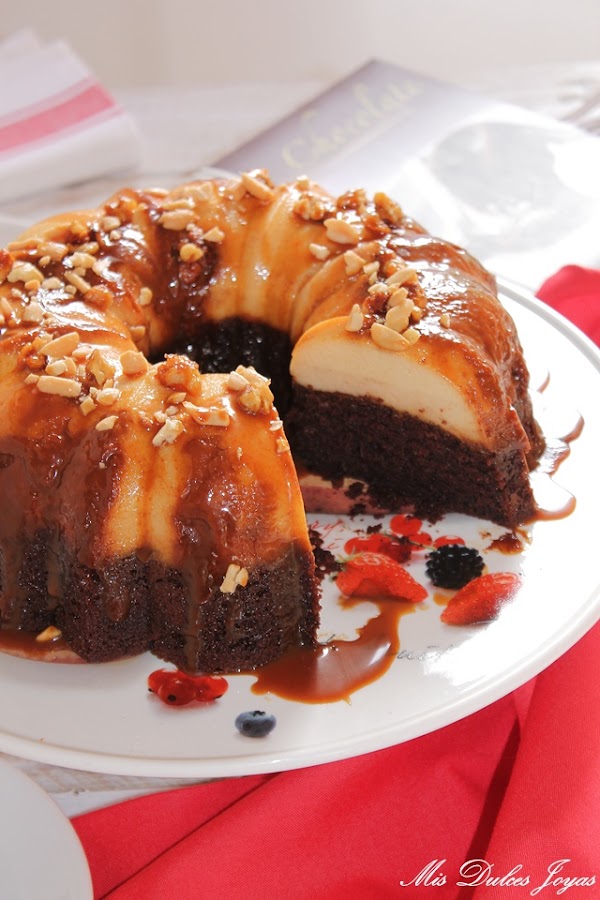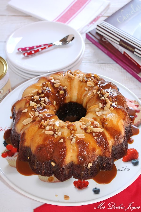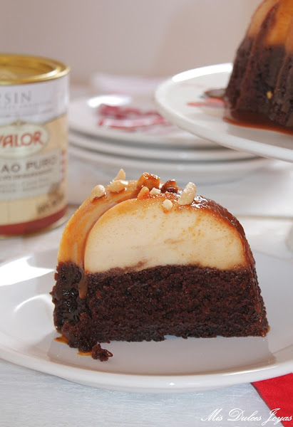 El chocoflan, también conocido como pastel imposible o diplomático, es un pastel de procedencia mexicana. Se hornea a baño maría y consiste en una capa de bizcocho de chocolate (por su textura similar a un brownie) y otra capa de flan preparado con leche condesada y leche evaporada. A la hora de hornearlo el molde se cubre con una capa de salsa de caramelo o dulce de leche. Los mexicanos suelen usar cajeta, se trata de un dulce de leche tradicional, típico de México y elaborado a partir de leche de cabra. Como aquí la cajeta cuesta encontrarla, perfectamente se puede emplear salsa de caramelo o toffee, o dulce de leche clásico (tal y como lo conocemos aquí), elaborado con leche de vaca. Yo lo he preparado con una salsa de toffee casera y el resultado ha sido espectacular.