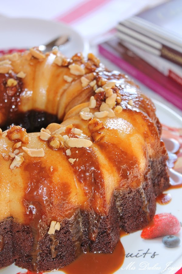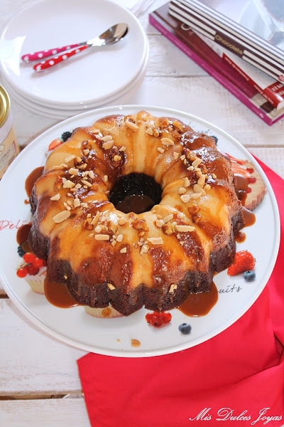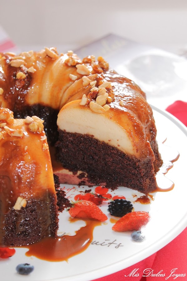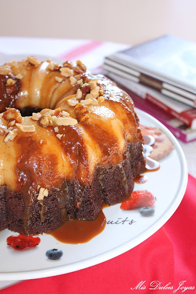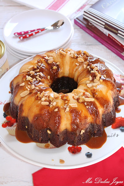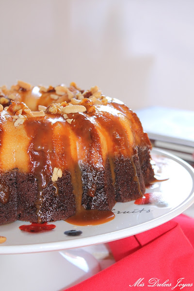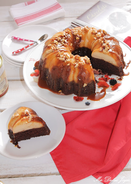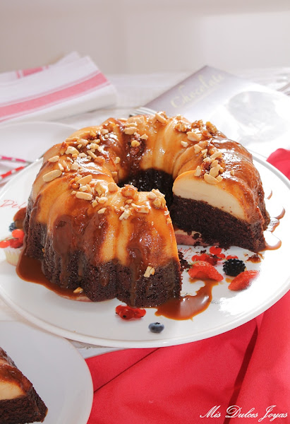 ¿Os imagináis estos tres componentes brownie, flan y dulce de leche (o salsa de toffee en este caso) juntos? Ahora me entendéis cuando digo que este pastel es un pecado total !!!! Imaginaros como está este bizcocho empapado de los jugos que van soltando la salsa de toffee y el flan !!!!