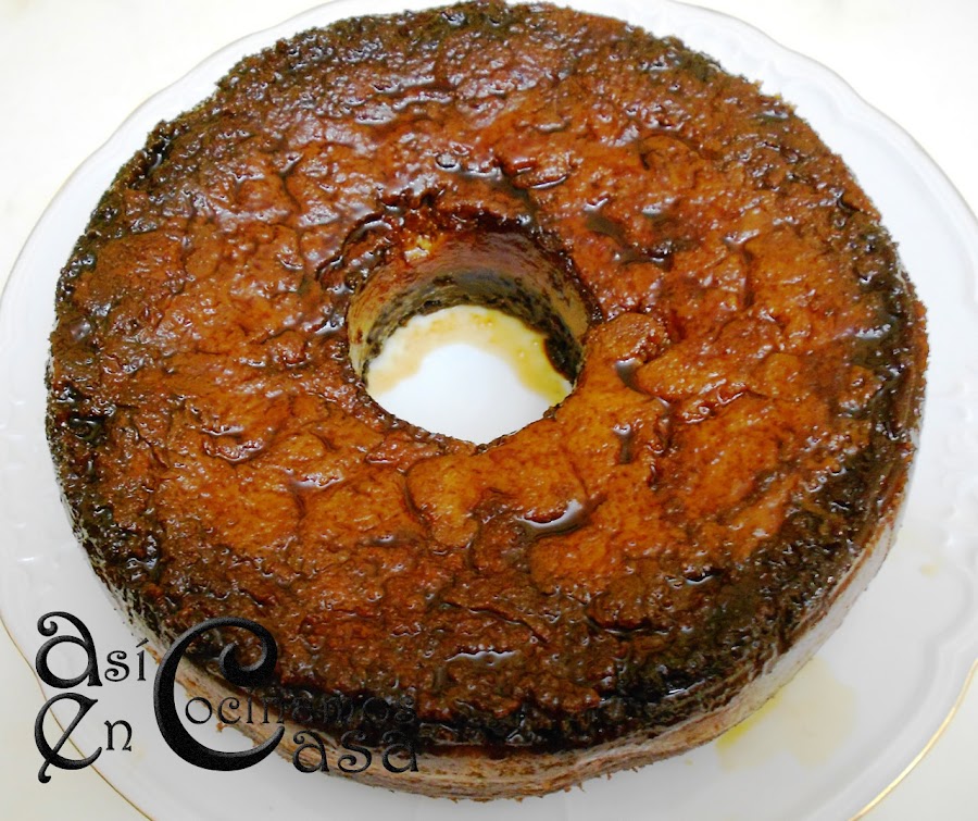 Es un postre contundente, pesa muchísimo, pero es que ya veréis ahora cuando lo explique; lleva, entre otras cosas 8 "ocho" huevos!!!!!!! También os digo que creo que me pasé de caramelo y eso ha hecho que la parte de flan no quede tan blanca como debiera. A ver si la próxima vez le pongo menos y queda más bonito. Bueno, ahí os dejo la receta.