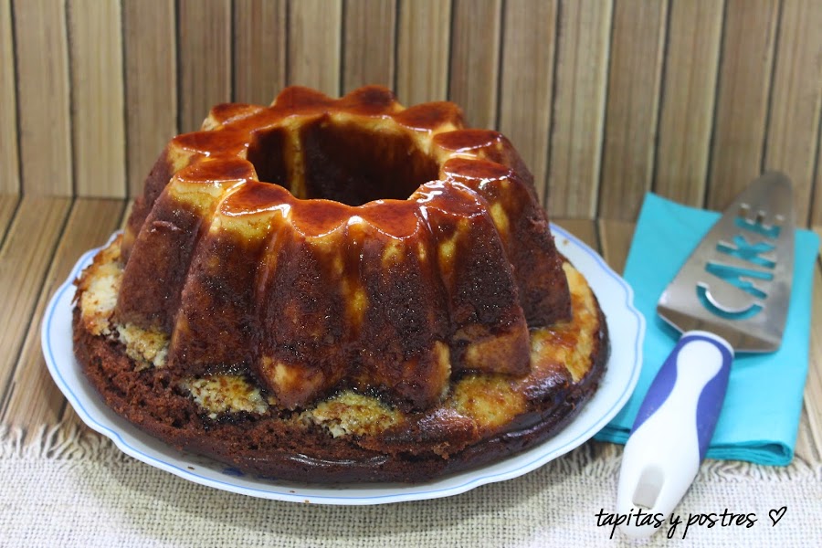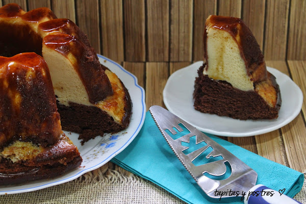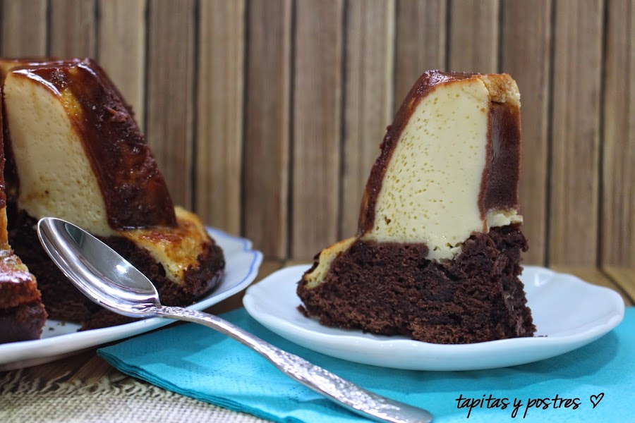 Hace tiempo preparé un postre que llamaban pastel inteligente, estaba de moda en internet y mucha gente lo hacía. La particularidad de este dulce era la forma en que se invertían los ingredientes en su preparación, de manera que lo que estaba abajo subía y viceversa. Y aunque estaba muy bueno, no se notaban bien las dos capas, pues eran casi del mismo color. Este que os traigo hoy es mucho más "inteligente" porque al ser bizcocho de chocolate las capas se aprecian muy bien.