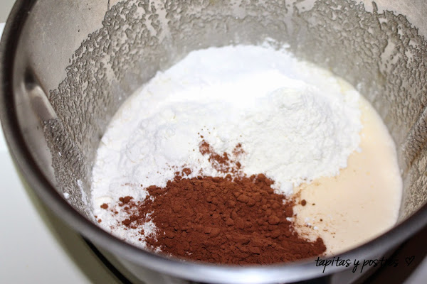Agregamos la harina, levadura y cacao. Volvemos a mezclar.
