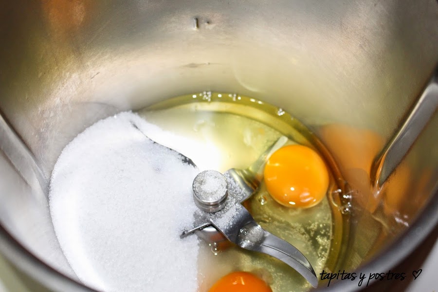 Ponemos los huevos con las dos clases de azúcar en el vaso y blanqueamos cinco minutos, a velocidad 3 ½.