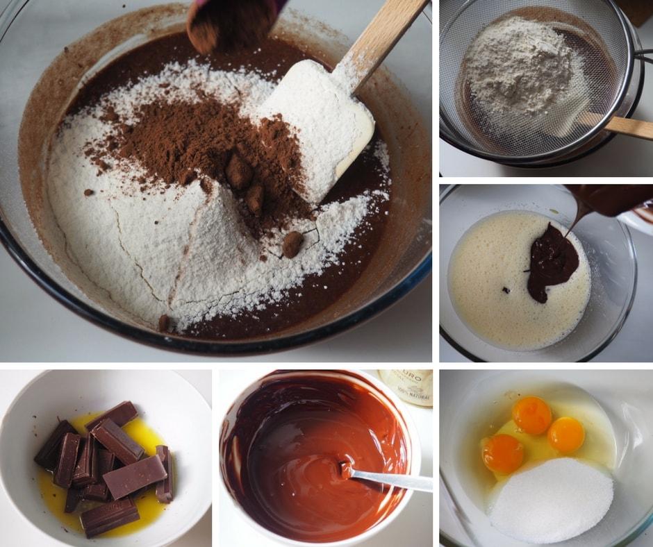Esta receta la vamos a explicar en dos pasos, primero vamos a hacer la elaboración del bizcocho o pastel de chocolate. 1. En primer lugar, ponemos en un bol los 75 gr de mantequilla, la fundimos unos segundos en el microondas y echamos los 125 gr de chocolate para fundir en la mantequilla, removemos hasta que queda bien fundido e integrado. 2. A continuación, ponemos en un bol, los 3 huevos y los 100 gr de azúcar, batimos bien durante unos minutos, hasta que vemos que nos va quedando blanquecino. Ahora le añadimos el chocolate que tenemos fundido con la mantequilla y removemos bien hasta integrarlo. 3. Seguidamente, tamizamos los 75 gr de harina y lo añadimos a la mezcla de los huevos con el chocolate. Añadimos 2 cucharaditas de cacao puro en polvo, y mezclamos todo bien. Ahora hacemos el caramelo líquido, ponemos en una sartén las 3 cucharaditas de azúcar y una de agua, lo llevamos a fuego bajo, removiendo hasta que el azúcar se empiece a caramelizar. Colocamos el caramelo en el fondo de un molde, yo he usado uno de plum cake, y volcamos la mezcla de chocolate que tenemos encima del caramelo. Reservamos. Ahora preparamos el flan