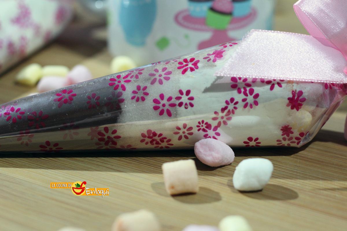 Cuando tus amigos o familiares reciban el regalo sólo tendrán que verter el contenido del cono (excepto los marshmalows o nubes que los reservaremos para el final) en una taza, cubrir con leche bien caliente, diluir todo y para terminar poner por encima las nubes de azúcar.