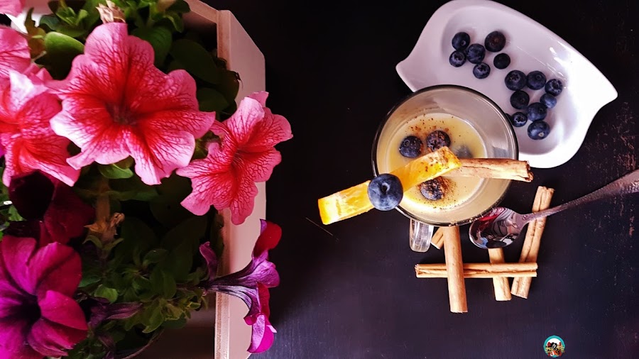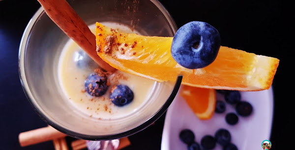 Para entrar en calor tengo una fabulosa taza de chocolate blanco con arándanos azules, zumo de naranja, licor de mango y canela.