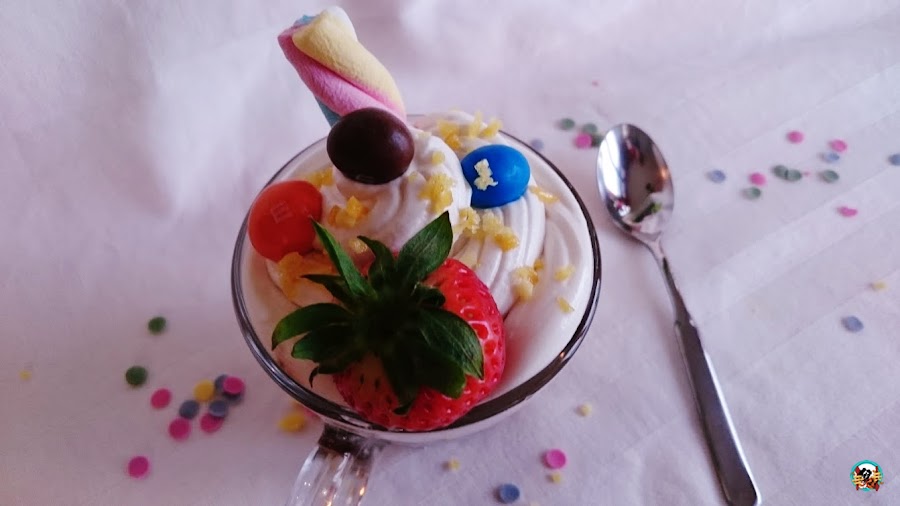2.-Preparamos el chantillí: en un vaso de batidora añadimos la leche, el azúcar y el sobre de chantillí. Montamos el chantillí con las varillas eléctricas. Ponemos la crema en una manga pastelera y decoramos cada taza de chocolate con la crema. Lavamos las fresas y las secamos con papel de cocina. Decoramos cada taza con una freza, la mitad de una nube, los smarties y los caramelos zata peta.