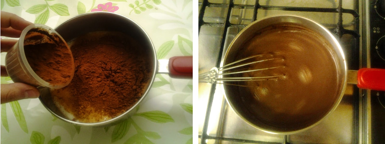 Cuando la leche con chocolate empiece a hervir, baja el fuego y añade, sin dejar de remover, el agua con maizena. La mezcla empezará a espesar cuando la mezcla hierva de nuevo. Espera un minuto, sin dejar de remover, y apaga el fuego.
