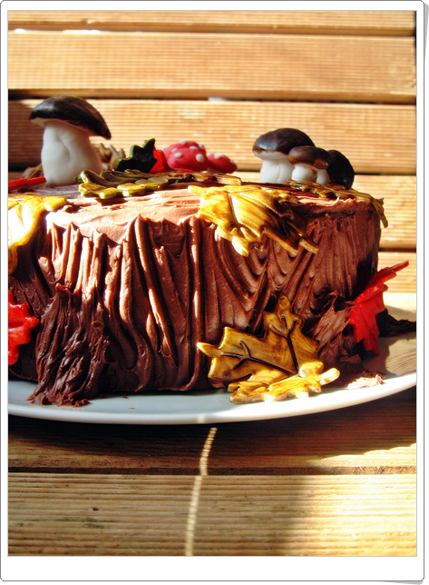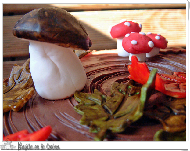 Ahora toca hacer la decoración. Si se quiere dejar así listo, al frigo al menos una hora para que coja cuerpo (mejor más tiempo). Yo como era un tronco, utilicé la vuelta de un tenedor para hacer la forma de las vetas. Y después al frigo hasta el día siguiente que es cuando lo íbamos a consumir y antes le puse las decoraciones de fondant: los boletus, las amanitas y las hojas.