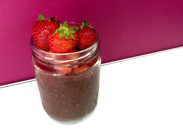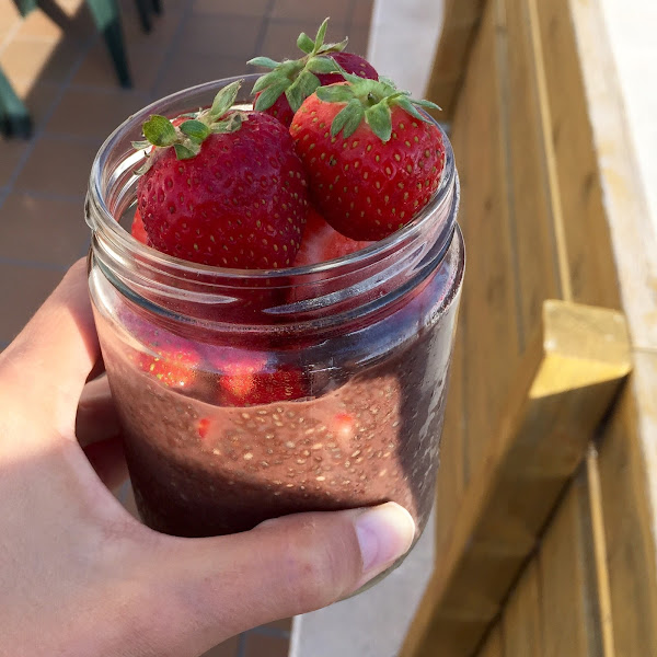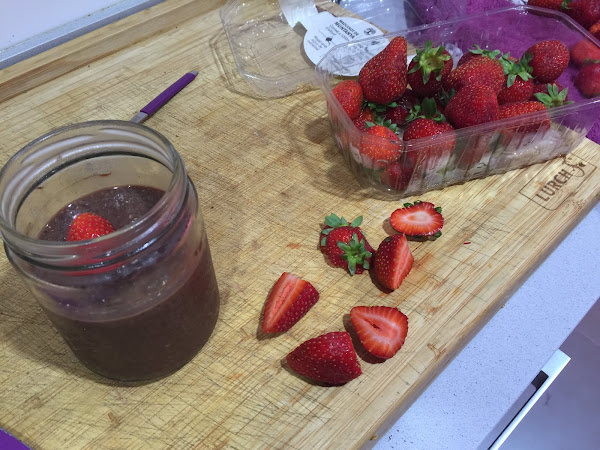 3. Lavamos, cortamos la zona verde de las fresas y lo ponemos sobre el puding de Chía, no os preocupéis que no se hundirán. La consistencia del puding es densa aunque no lo parezca, así que sujetará sin problema las fresas.