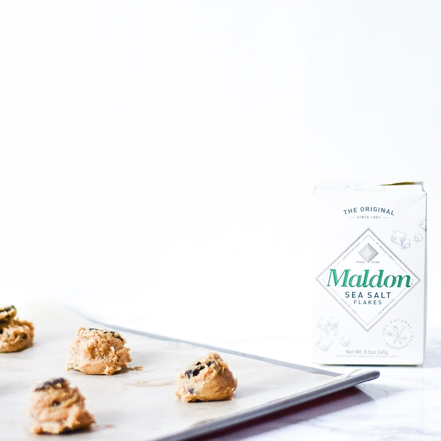 Utilizamos una cuchara de helado pequeña (porción de 2 cucharadas aproximadamente) y ponemos las bolitas sobre las charolas dejando un espacio de 5 cm entre cada galleta. Aplastamos un poco, cuidando la forma de nuestras galletas, y espolvoreamos un poco de sal Maldon.