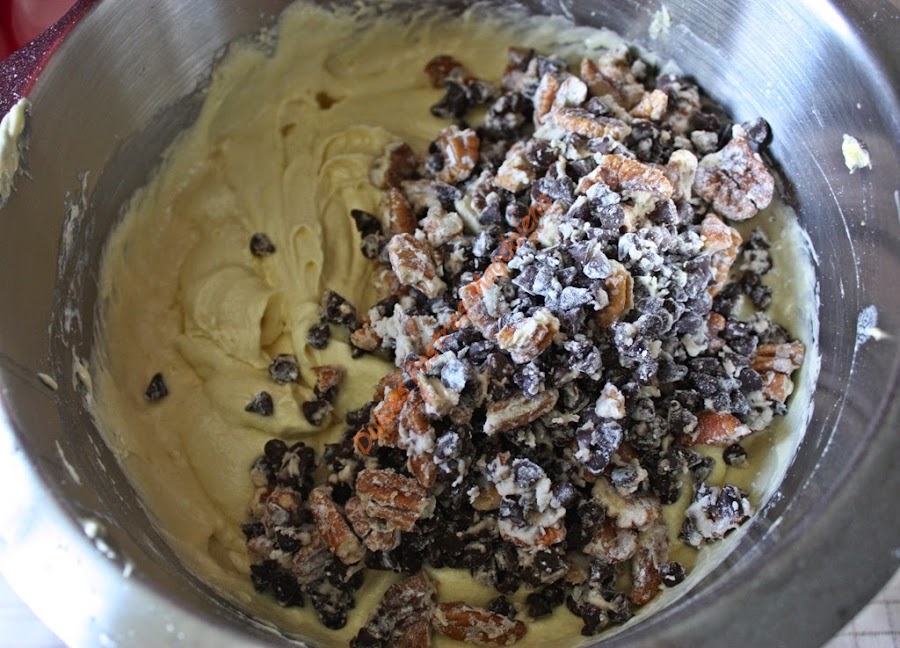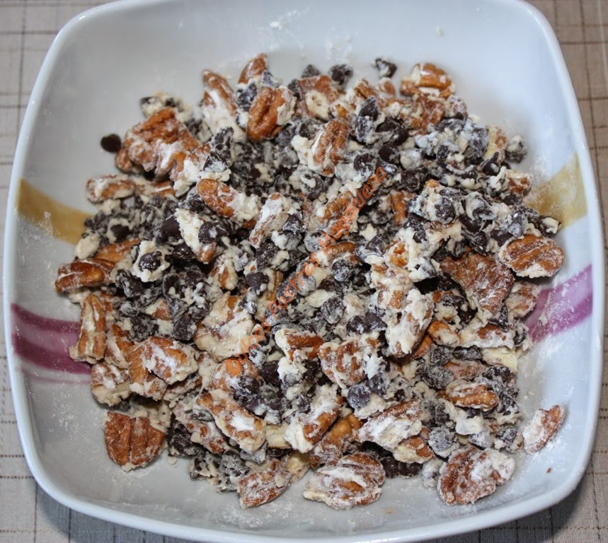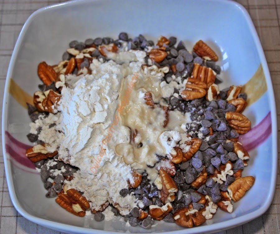 En un recipiente, mezclar las nueces y las pepitas de chocolate, añadir 2 cucharadas de la mezcla de buttermilk y 30 gr de la mezcla de la harina y mezclar todo muy bien (este proceso se hace para evitar que una vez echadas en la mezcla, se vayan al fondo del molde, así quedaran repartidas uniformemente).