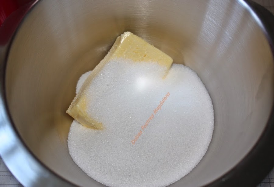 Batir la mantequilla con el azúcar hasta obtener una mezcla blanquecina y cremosa.