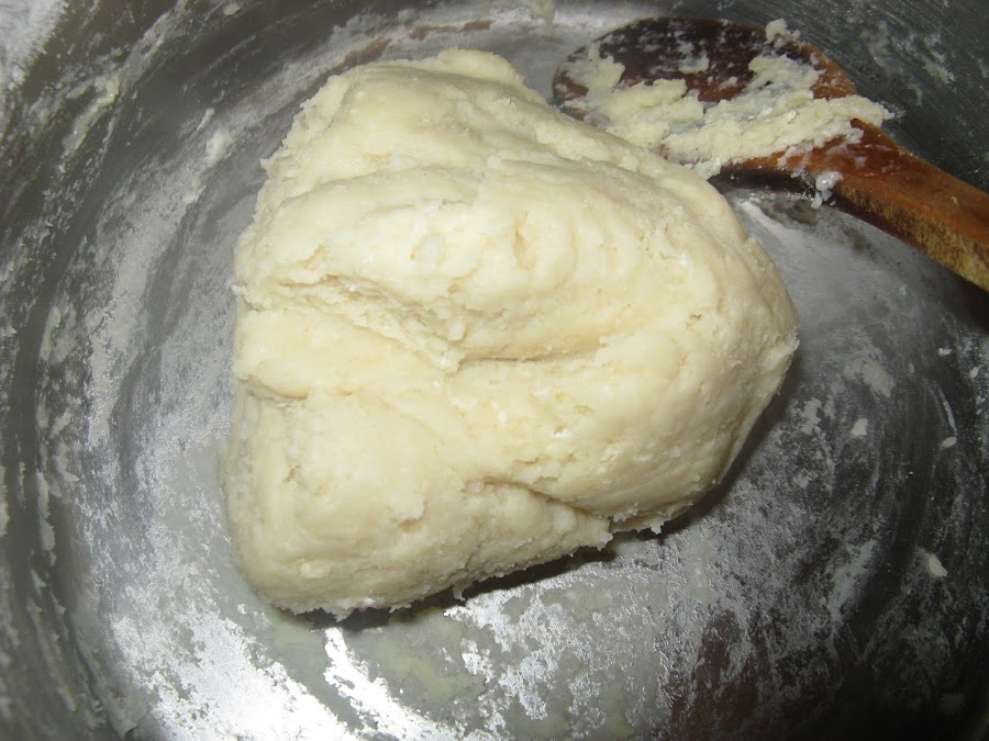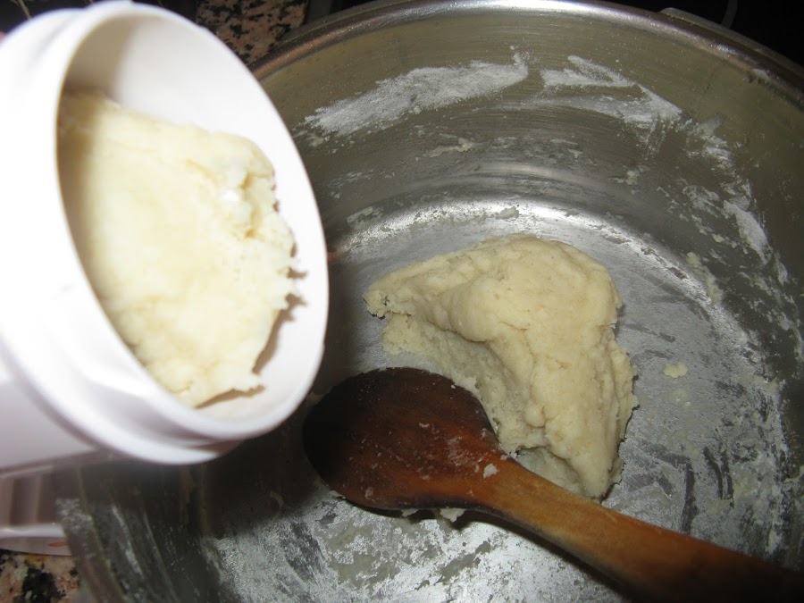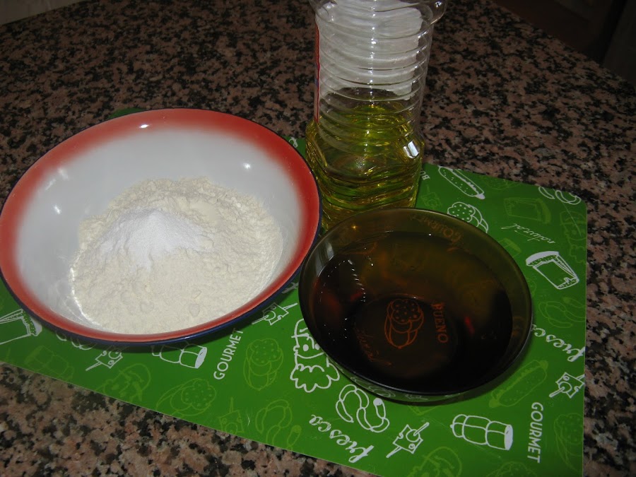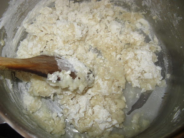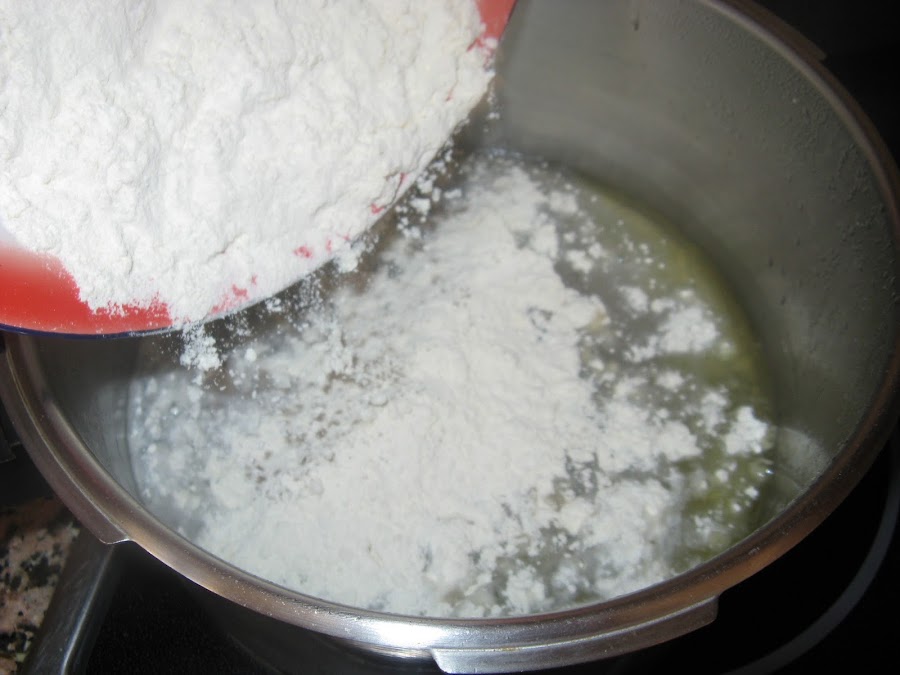 Cuando hierva retiramos del fuego y echamos la harina, en la cual ya habremos echado la levadura química (mejor tamizada)