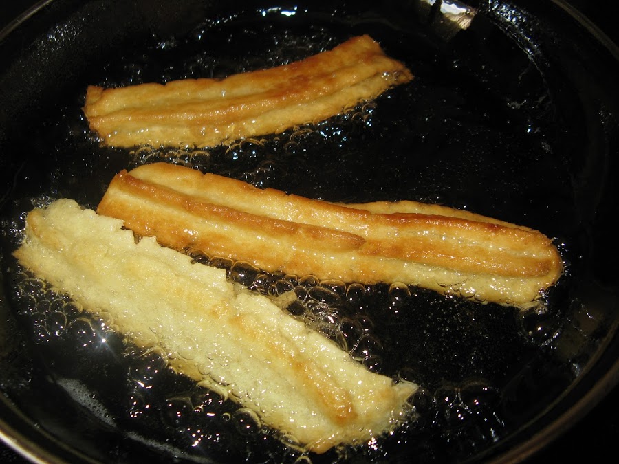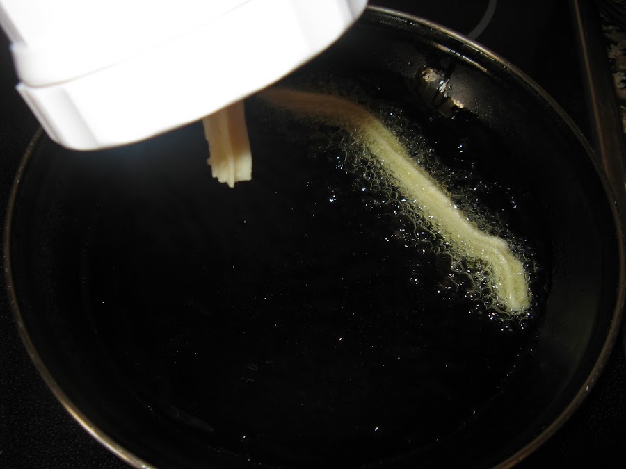 Ponemos a calentar aceite en una sartén y vamos echando los churros.