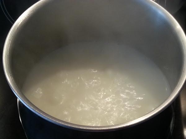 1. - Siguiendo las instrucciones de las natillas, apartamos 100 ml de leche y calentamos el resto con 4 cucharadas de azúcar.