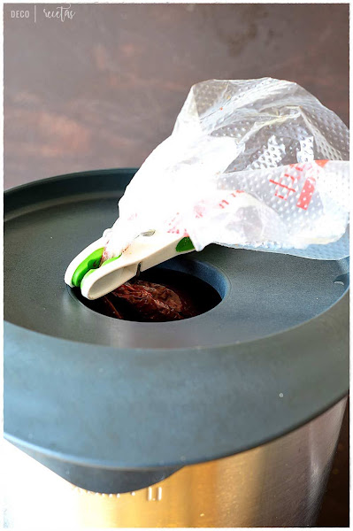 En esta técnica sí que no ensucias nada de nada porque lo que está dentro del vaso de la Thermomix será agua.Es la técnica más cómoda ya que el chocolate está depositado dentro de una manga pastelera