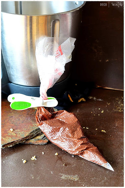 Cierra con el vaso de la Thermomix dejando la parte superior de la manga por dónde se introducen chocolate por fuera del vocal del vaso, es decir que la manga pastelera asomé por el agujero del vaso de la Thermomix.