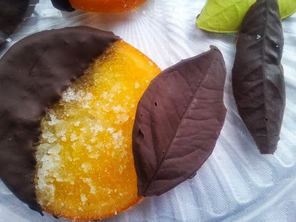 Y por último deciros que para elaboraciones sencillas como cubrir hojas o que una parte de una galleta o fruta quede cubierta con chocolate atemperado, lo único que debemos hacer es introducirlo en el chocolate, dejar que caiga todo lo sobrante, ponerlo en una rejilla y esperar a que atempere. El proceso se puede acelerar metiéndolo unos minutos, no más de cuatro o cinco, para que enfríe antes, pero lo normal es que con una temperatura ambiente no muy alta, se seque rápidamente y con buenos resultados, es decir que brille, por ejemplo con una hoja de naranjo, la parte que tocaba la hoja y que esté duro y crujiente al morder.