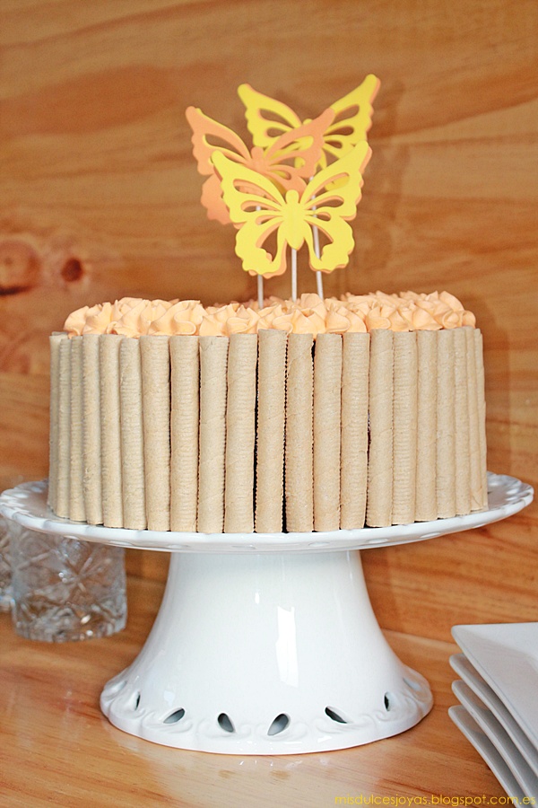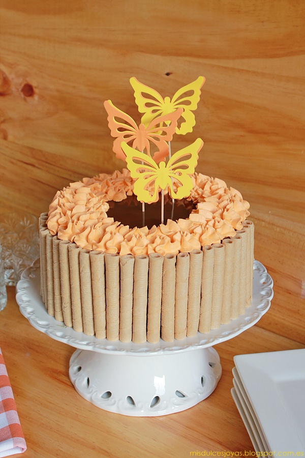 Para darle más dramatismo lo he decorado con unas neulas, un poco de nata montada (crema de leche), coloreada de color naranja, y lo he adornado con unas mariposas de goma espuma que tenía por casa. Pero se puede dejar únicamente con el glaseado por encima sin más decoraciones y estará igual de bueno y vistoso. Al ser de calabaza y por los colores que lo caracterizan (marrón oscuro y naranja), se puede decorar con alguna decoración típica de Halloween, como unos fantasmas de merengue, unas calabazas de fondant o unas arañas de chocolate alrededor, al gusto de cada uno.