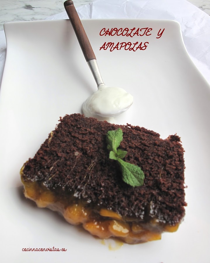 Mezclamos el yogur con el aceite con ayuda de unas varillas. Incorporamos los huevos y mezclamos bien. A esta mezcla le añadimos el resto de los ingredientes secos (harina, maizena, azúcar, cacao y las semillas de amapola molidas).