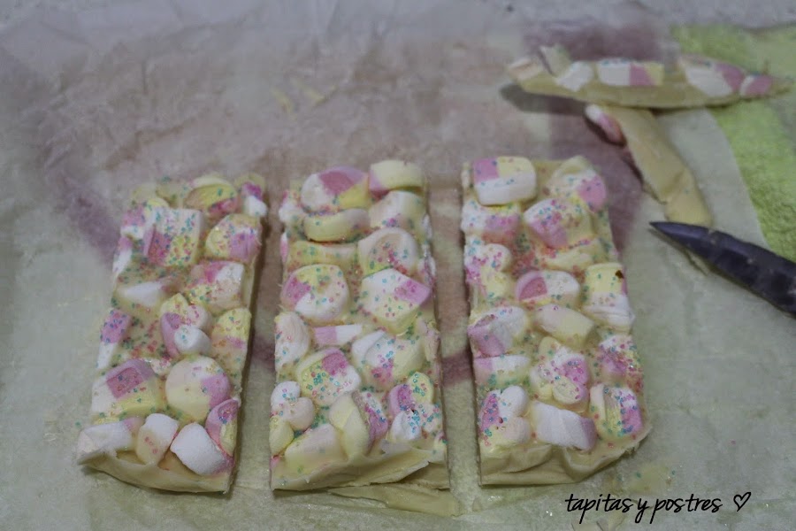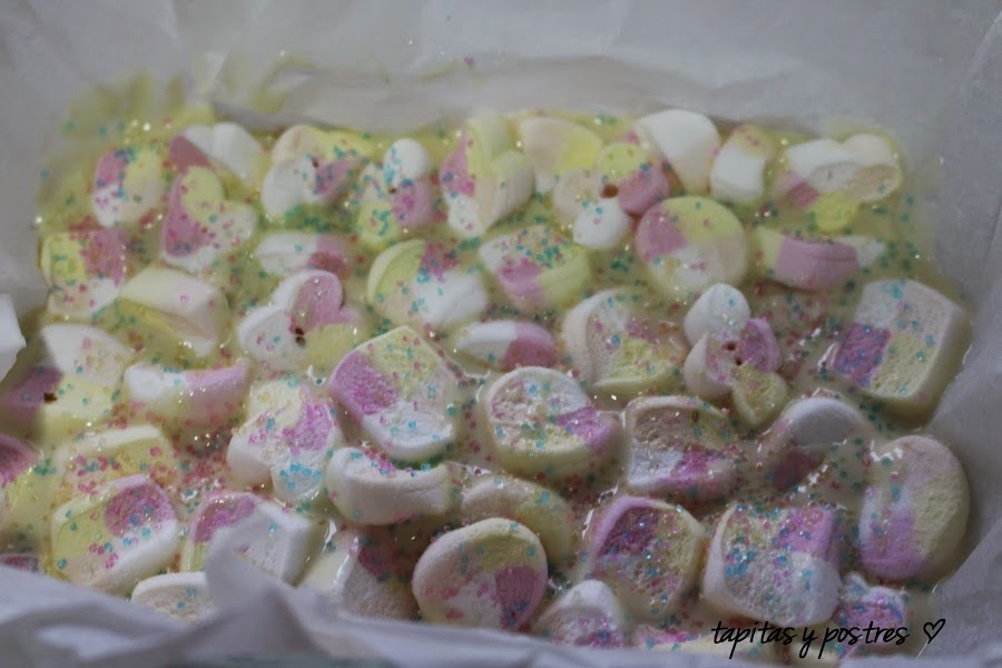 Vertemos el chocolate fundid en un molde cuadrado o alargado forrado de papel vegetal y echamos por encima las nubes a trozos. Espolvoreamos azúcar de colores o bolitas? y metemos en el congelador unos 20 minutos para que las nubes no se nos derritan.
