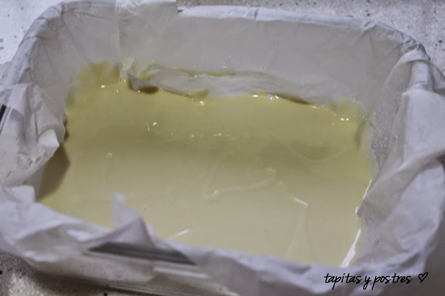 Vertemos el chocolate fundido en un recipiente cuadrado o alargado forrado con papel vegetal.