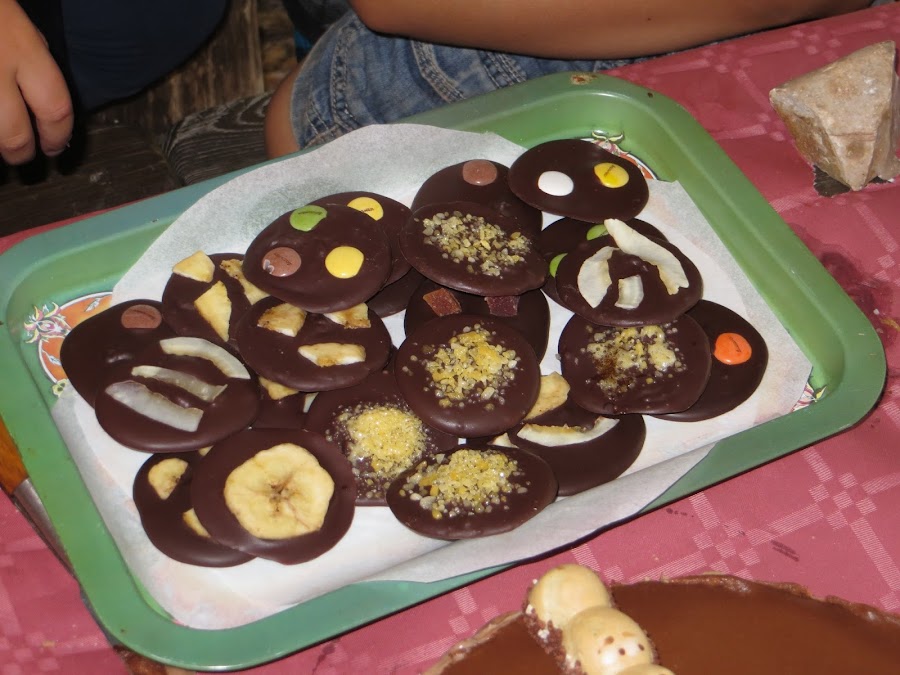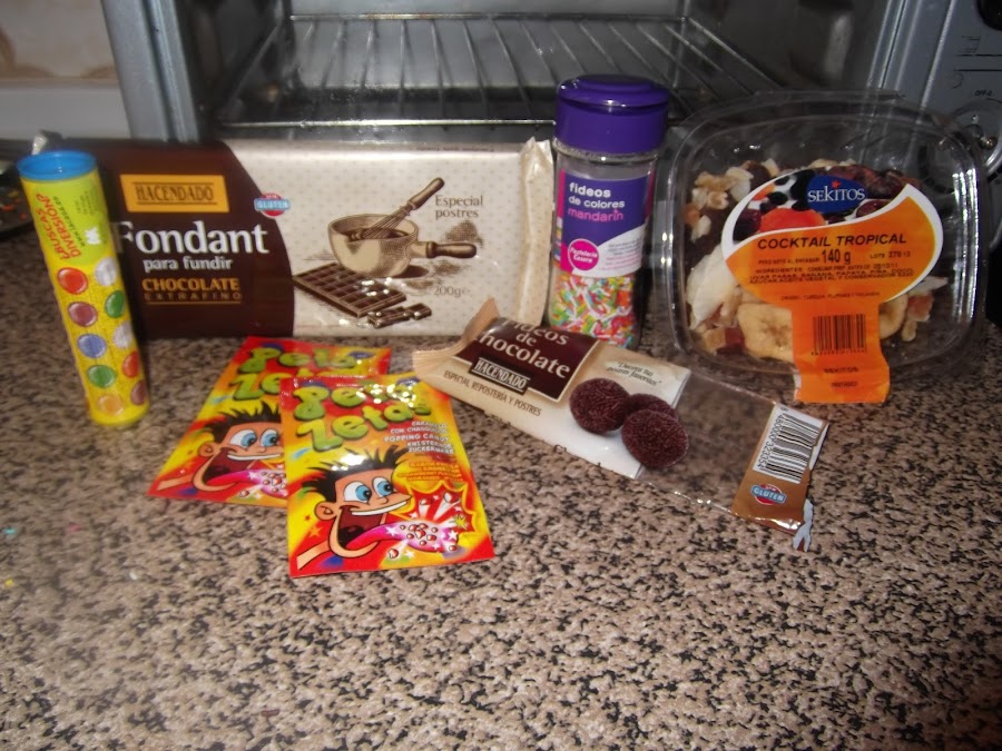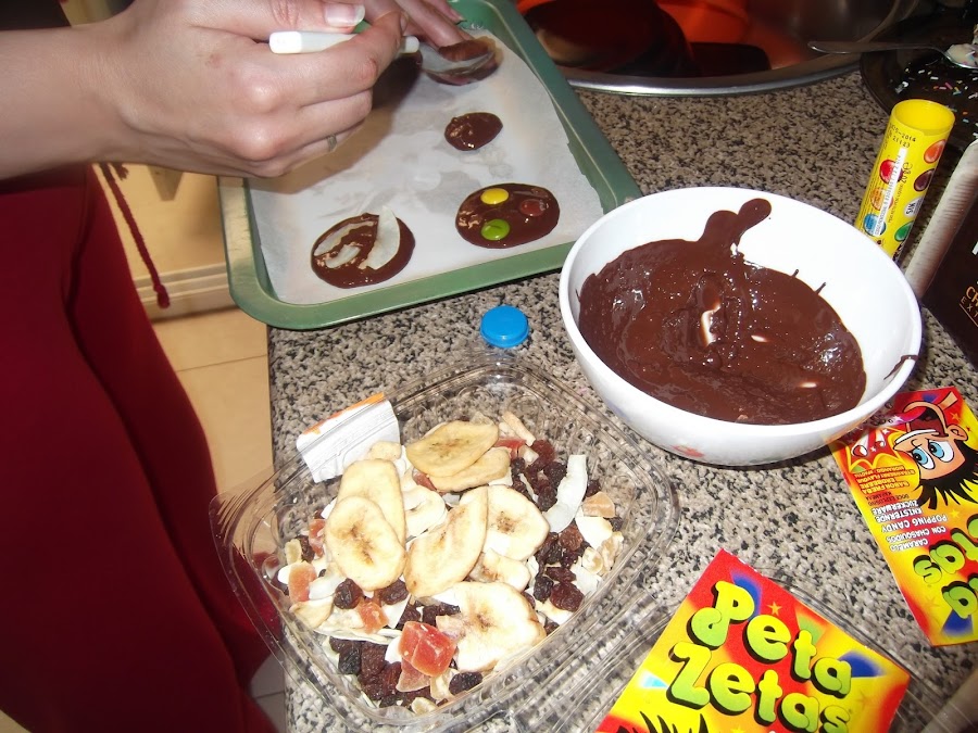 El siguiente paso es colocarle lo que queráis encima, yo utilicé frutos secos deshidratados que tenía por casa, sobre todo quedan muy bien con plátano, lacasitos e incluso peta zetas para que tuvieran cierto chisporroteo cuando te los metes a la boca. Metes las chocolatinas al frigorífico para que se solidifique el chocolate y en un par de horas ya están listas para comer. Eso sí tened cuidado ahora en el verano porque enseguida se derriten, aunque no tendréis que preocuparos mucho de eso, ya que tal y como las sacáis volarán de vuestras manos.