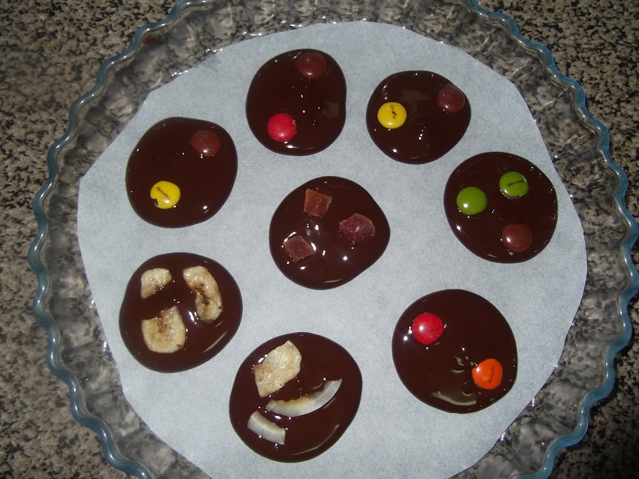 Lo único que tenéis que hacer es derretir el chocolate al microondas, ya sabéis a una potencia muy baja para que no se os queme el chocolate. Luego colocáis en una bandeja papel de horno y con el chocolate fundido vais haciendo las chocolatinas. Si sois muy mañosas, les podéis dar diferentes formas a las chocolatinas, si no lo sois, como me pasa a mí, pues las hacéis redondas y punto. Dependiendo del grosos que le deis, así os van a salir las chocolatinas. Yo la verdad es que no les dí mucho para que no fueran muy empalagosas.