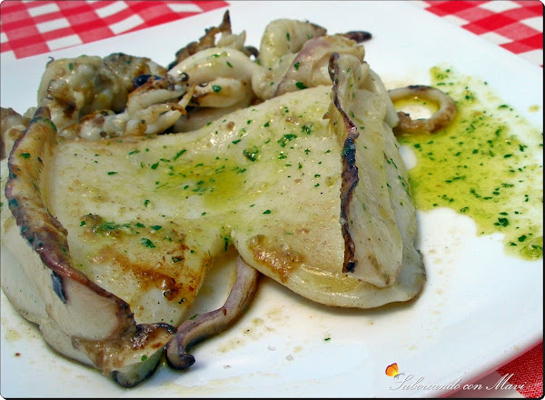 Salpimentarlos los chocos y los hacemos abiertos ala plancha cuando casi estén hechos les echo por encima una cucharadita del majado, así cogen más sabor y sin embargo no se quema el ajo.