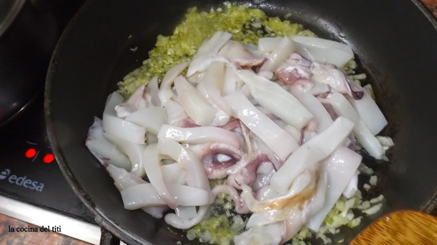 Añadimos los chocos y dejaremos rehogando, con fuego suave en un intervalo de unos 5 minutos sin dejar de mover y que el choco nos coja color