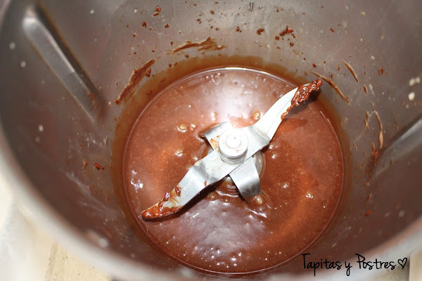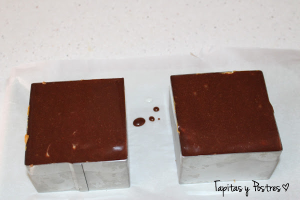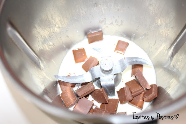 Para hacer la cobertura de chocolate, calentamos la nata (crema de leche) 3 minutos a 100º y velocidad 1. Añadimos el chocolate troceado y batimos 2 minutos a velocidad 3. Esto se puede hacer en un cazo, calentando la nata (crema de leche) y derritiendo en ella el chocolate.