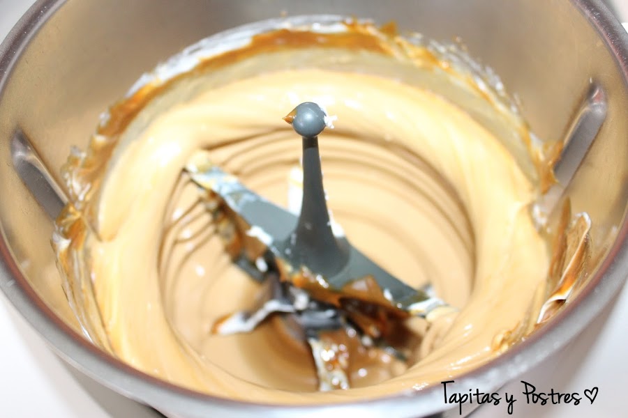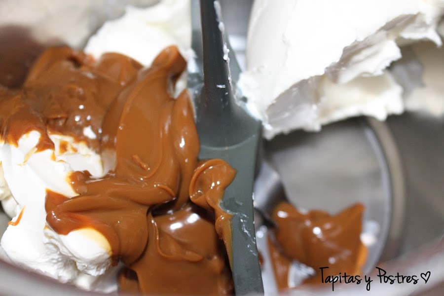 Primero vamos a preparar la crema de dulce de leche batiendo el queso y el dulce de leche en el vaso de la thermomix, con la mariposa, unos 20 segundos a velocidad 3 1/2. También lo podemos hacer con una batidora de varillas.