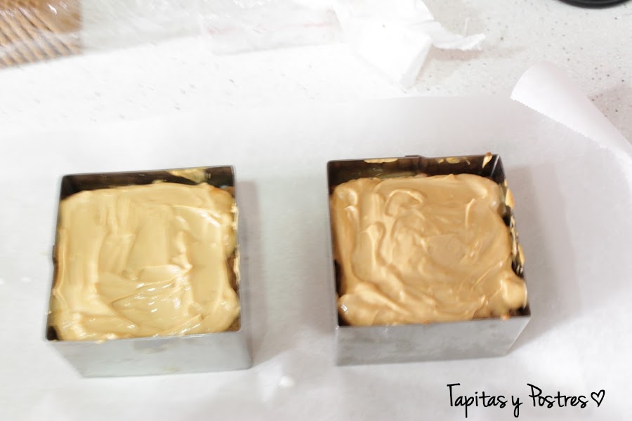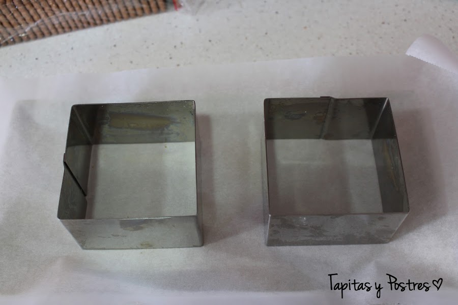 Preparamos el molde, yo usé moldes individuales sin fondo por lo que los puse sobre una bandeja con papel vegetal.