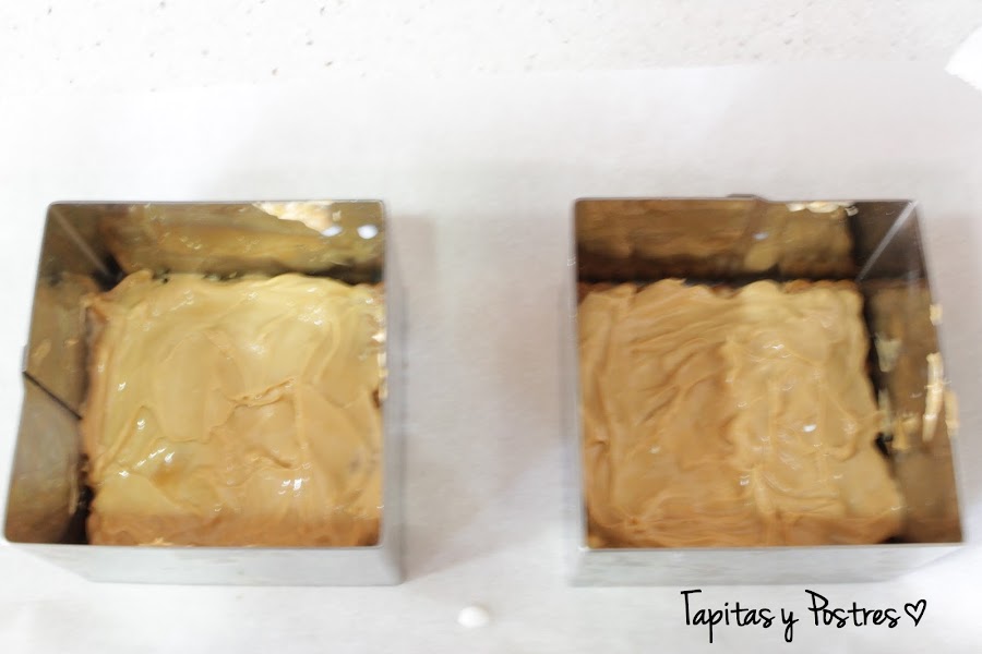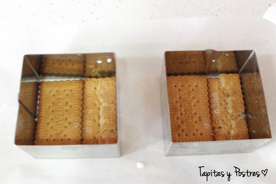 Vamos mojando ligeramente las galletas en la leche y las colocamos en el fondo del molde elegido. Yo he usado moldes cuadrados individuales. Encima ponemos una capa de crema y después otra vez galletas. Tenemos que tener cuatro capas de galletas y cuatro de crema por lo que debemos acabar con una capa de crema. Guardamos en la nevera.