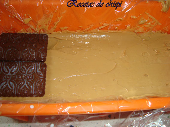 Tapamos todos los huecos que queden descubiertos con trocitos de galletas. Terminamos con galletas. Dejaremos un poco de crema para cubrir totalmente cuando esté fria
