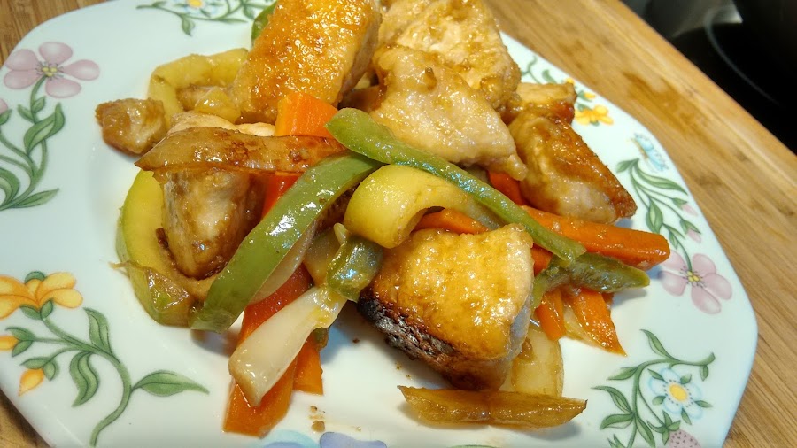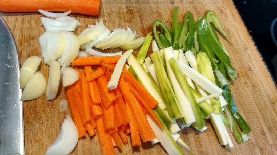 Verdura variada; En este caso Zanahoria, Calabazín, Cebolla y pimiento. Podéis poner champiñones, setas, pimiento de asar... lo que mas os guste ó tengáis en ese momento.