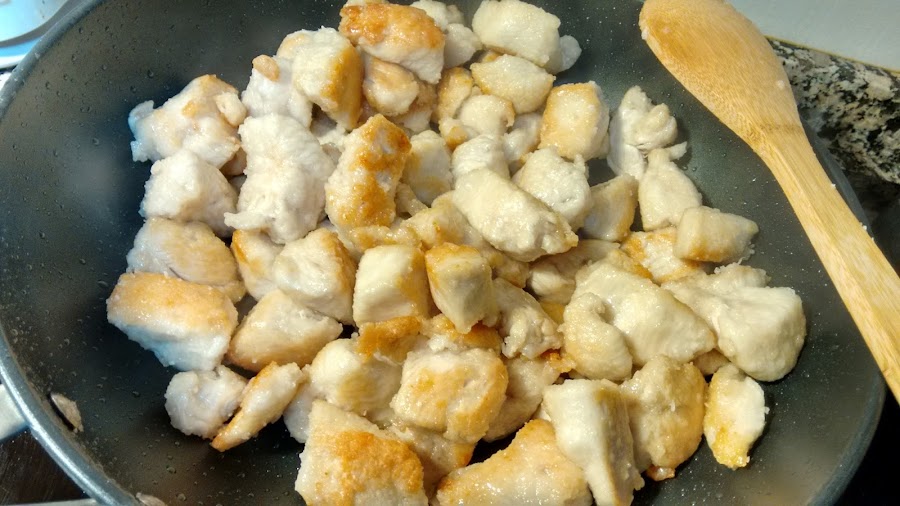 Salteamos a fuego fuerte en un Wok con un poco de aceite de girasol y reservamos.