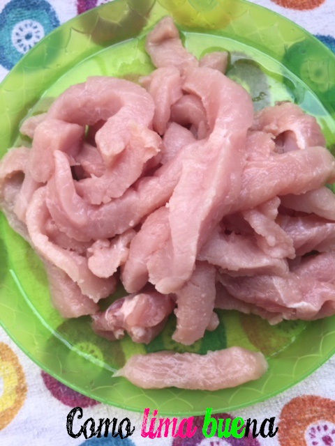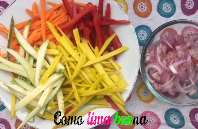 Cortar en tiras pequeñas y parejas la cebolla, la zanahoria, la calabaza, el pimiento y el zapallito. Reservar.