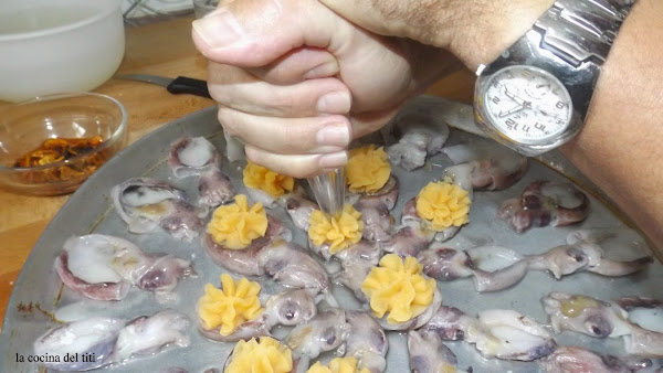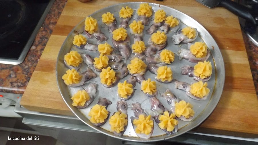 Este aperitivo o entrante consiste en hacer un pure de patatas, en el que mezclaremos con un ajillo que haremos aparte, rellenamos con la ayuda de una manga pastelera haciendo especie de duquesas y terminamos en el horno.