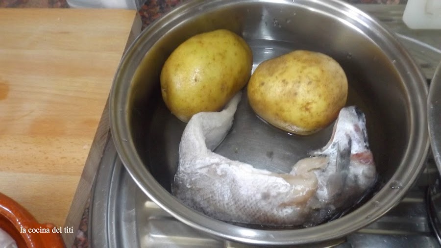 Pondremos las patatas a cocer junto a la espinas o pescado que aprovecharemos para hacer el fumet y en mi caso para hacer un pate con la pescadilla que he metido