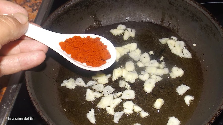 añadimos el pimenton dulce y picante una vez dorado los ajos