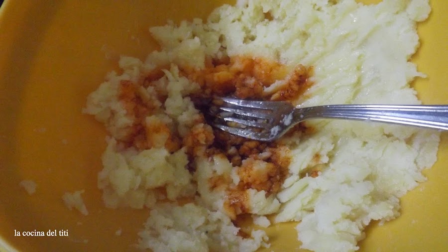 una vez la patatas cocidas las trituramos con la ayuda de un tenedor, añadimos el fumet, la leche y el aceite de los ajos con el pimenton
