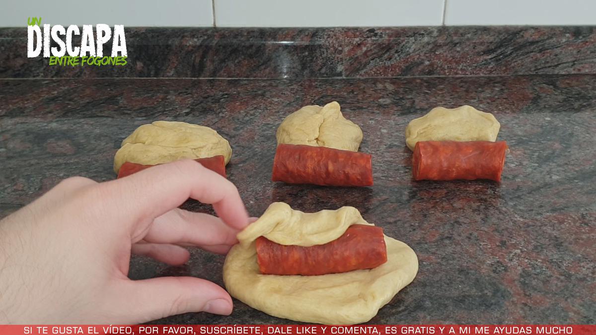 Ahora cogemos uno de los trozos y con los dedos los vamos aplanando, le colocamos un trozo de chorizo o también podéis utilizar chistorra y procedemos a envolver el chorizo con la masa, sellamos bien el choripán y lo dejamos en una bandeja de horno.