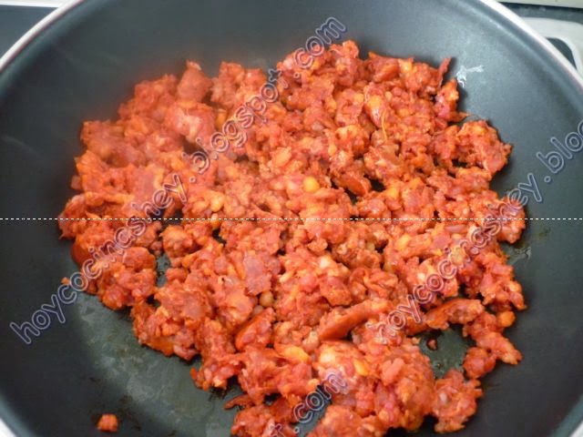Ponemos una cazuela al fuego y cuando caliente echamos el chorizo para que suelte la grasa,