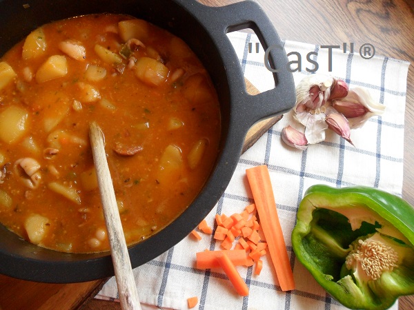 Añadimos el chorizo en rodajas y por ultimo las patatas "escachadas".