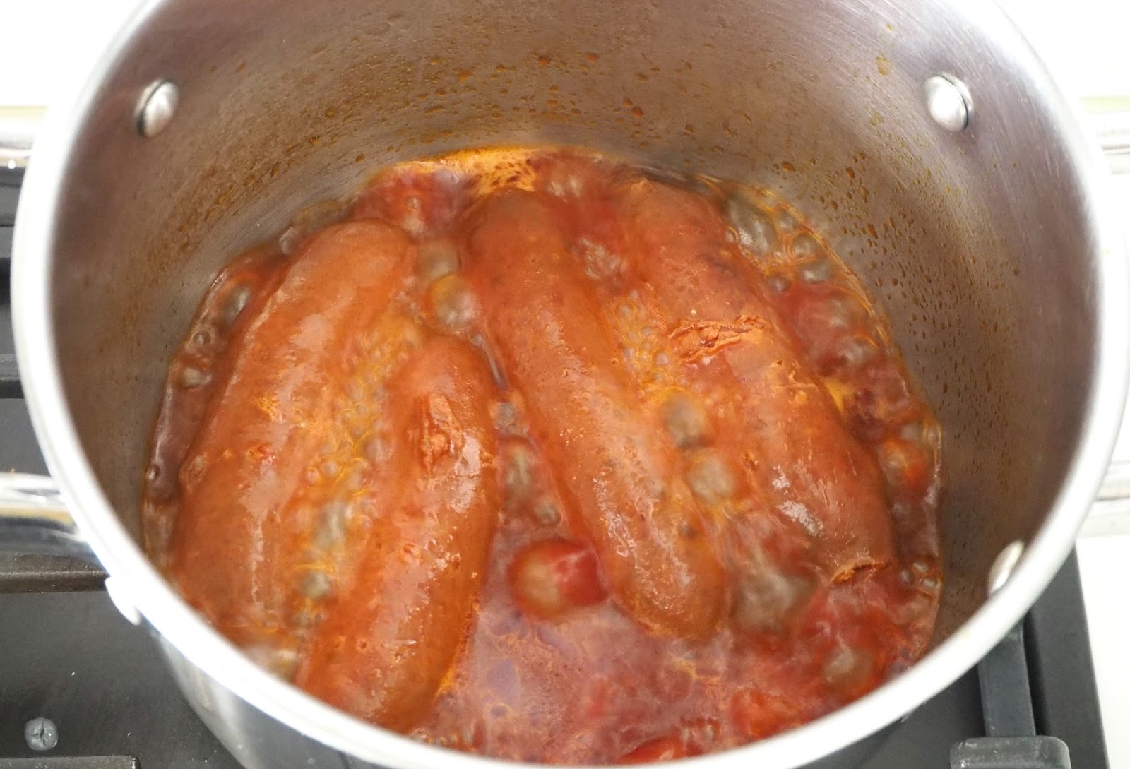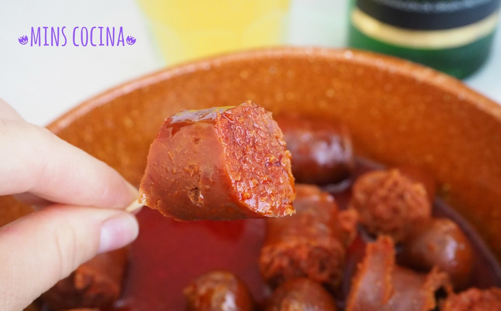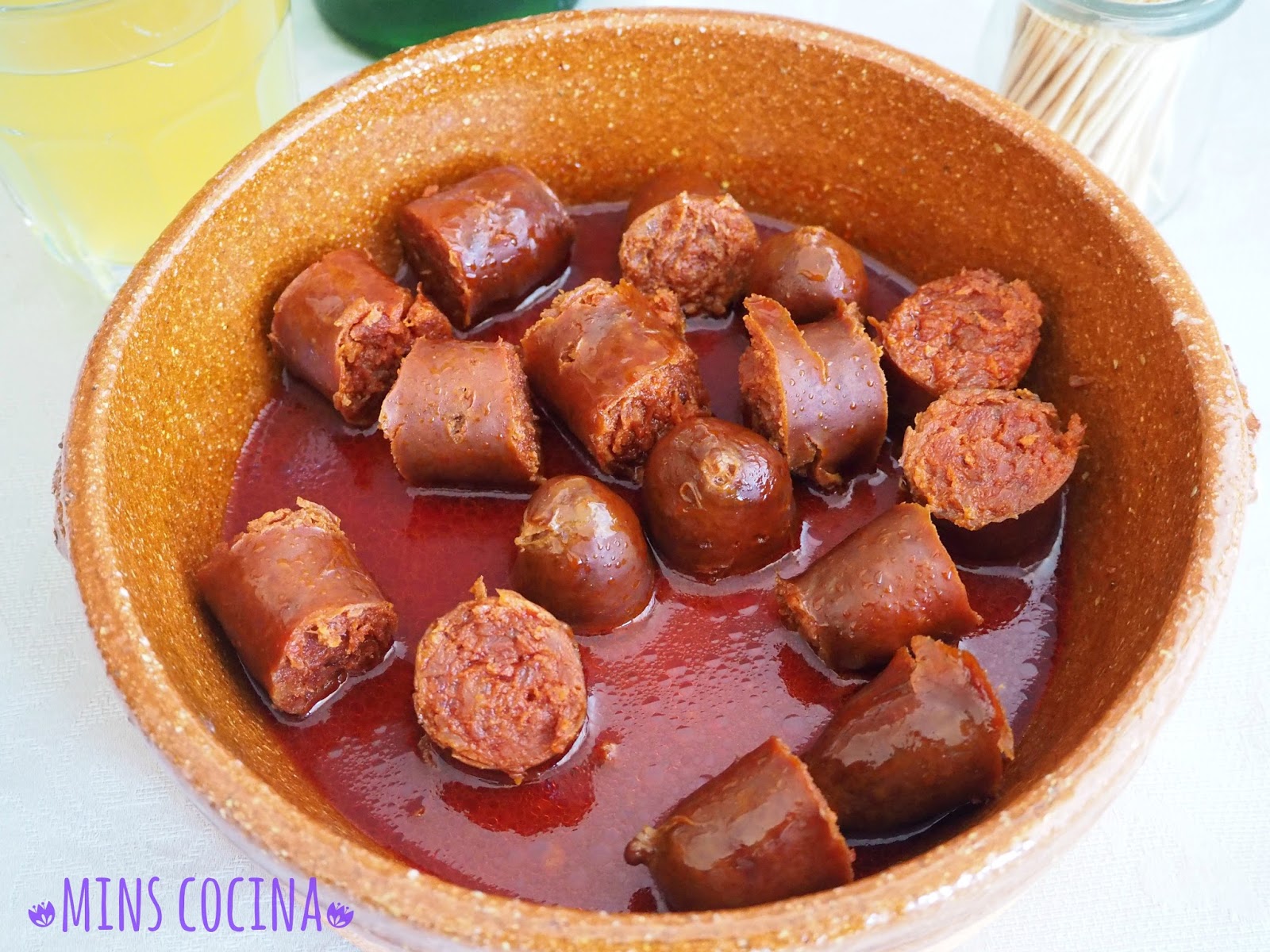 - Pasado el tiempo, cortamos los chorizos en varios trozos y los pasamos con parte de la salsa a un cuenco o fuente, si es de barro mejor, como en Asturias.