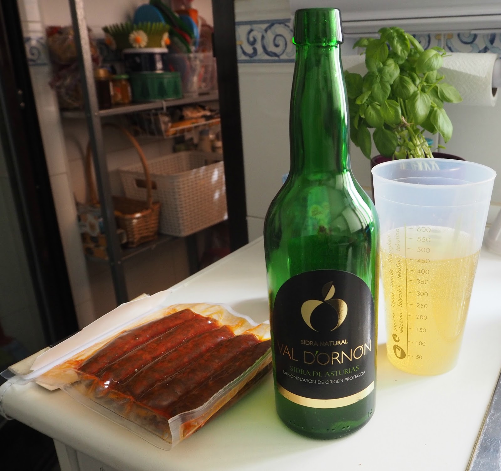 A finales del año pasado estuve un tiempo trabajando en Villaviciosa, Asturias. Asturias es una comunidad que me encanta y en la que he veraneado los últimos dos años. Entre otras muchas cosas me gusta mucho su cocina (y a quién no!) y en este último período que estuve trabajando allí me traje a la vuelta numerosos productos a cuál más rico: quesos, legumbres, embutidos, sidra... Entre otras cosas me traje unos chorizos asturianos envasados al vacío y como aún me quedaban sin abrir, el otro día decidí hacer una típica receta asturiana que no puede ser más sencilla ni más rica. Vale, muy contundente, no es para abusar y menos a un mes de mi boda (os había dicho que me caso?!!!!!!!!!), pero un pequeño y esporádico aperitivo el día del cumple de mi padre tampoco hace daño. Era un día de fiesta! (si solo fuera un día... ejem...). Bueno, el caso es que los hice para llevarlos para el aperitivo y los devoramos como si lleváramos un mes sin comer. Lo importante de esta receta, lo que determina que quede simplemente rica o superior, es la calidad del chorizo. Es lo que más influye. La sidra debe ser de la natural, típica asturiana. No la achampanada. Y hombre, está claro que si es buena mejor que mejor, pero lo importante de verdad: los chorizos. No lo olvidéis.