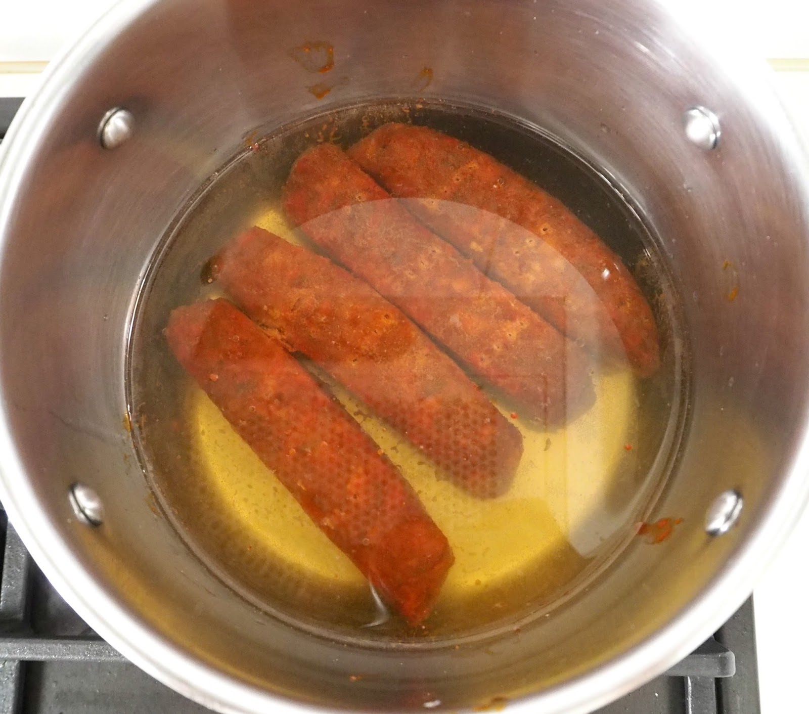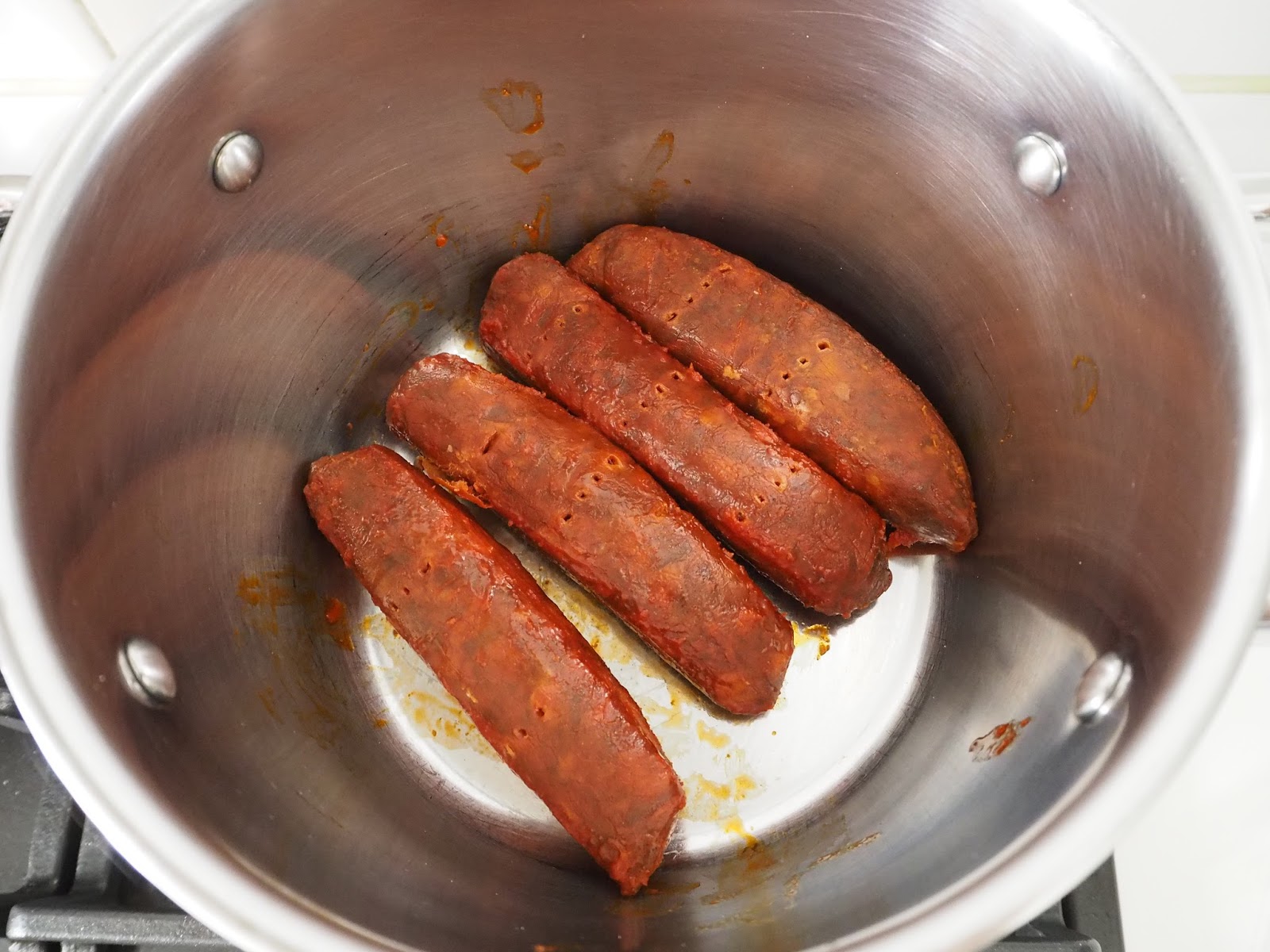 - Ponemos los chorizos en una cazuela alta. Los pinchamos con un tenedor o les hacemos pequeños cortes con un cuchillo para que saga la grasa y penetre bien la sidra.